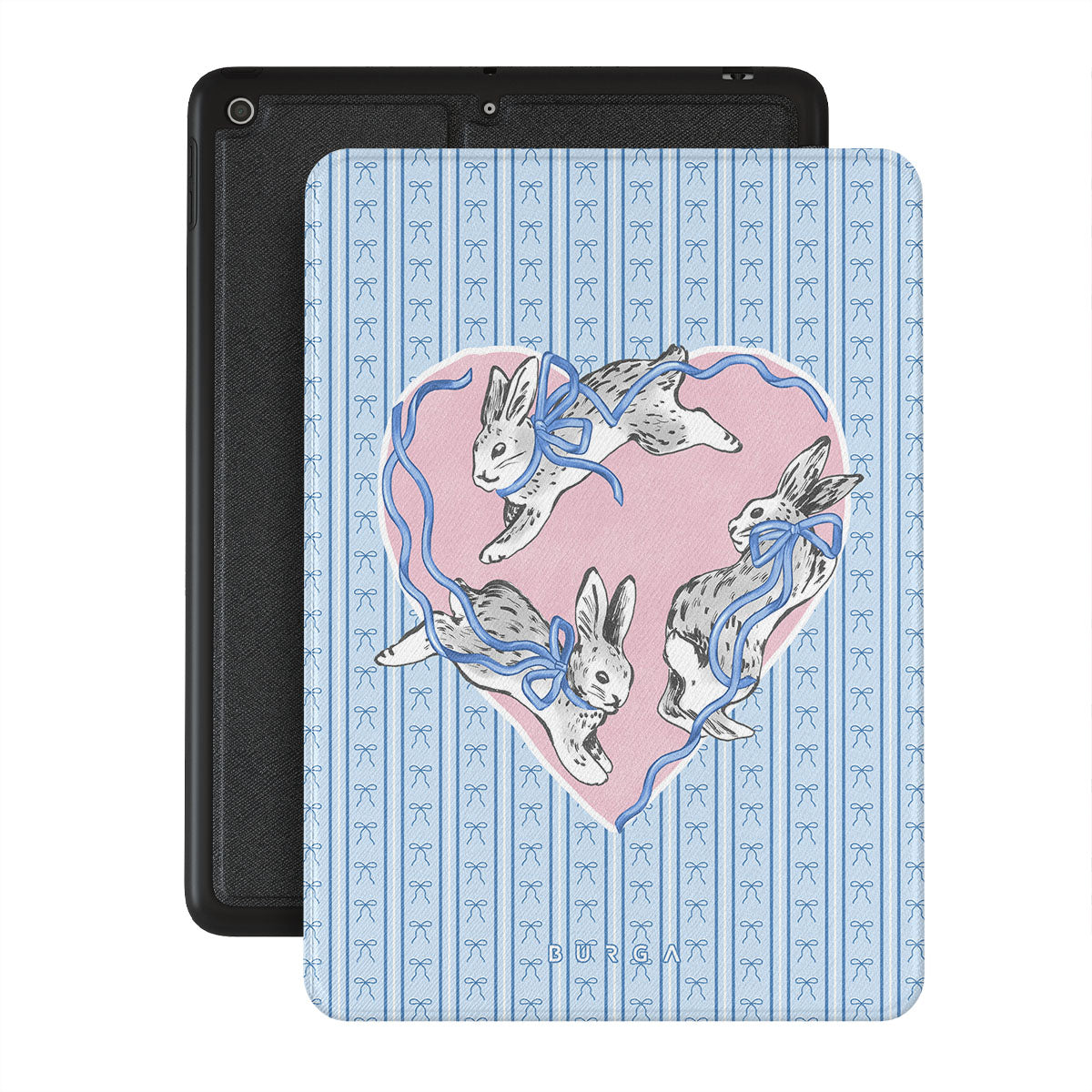 Kenmerken van dit design: witte konijnen, hartenlijst, blauwe strepen