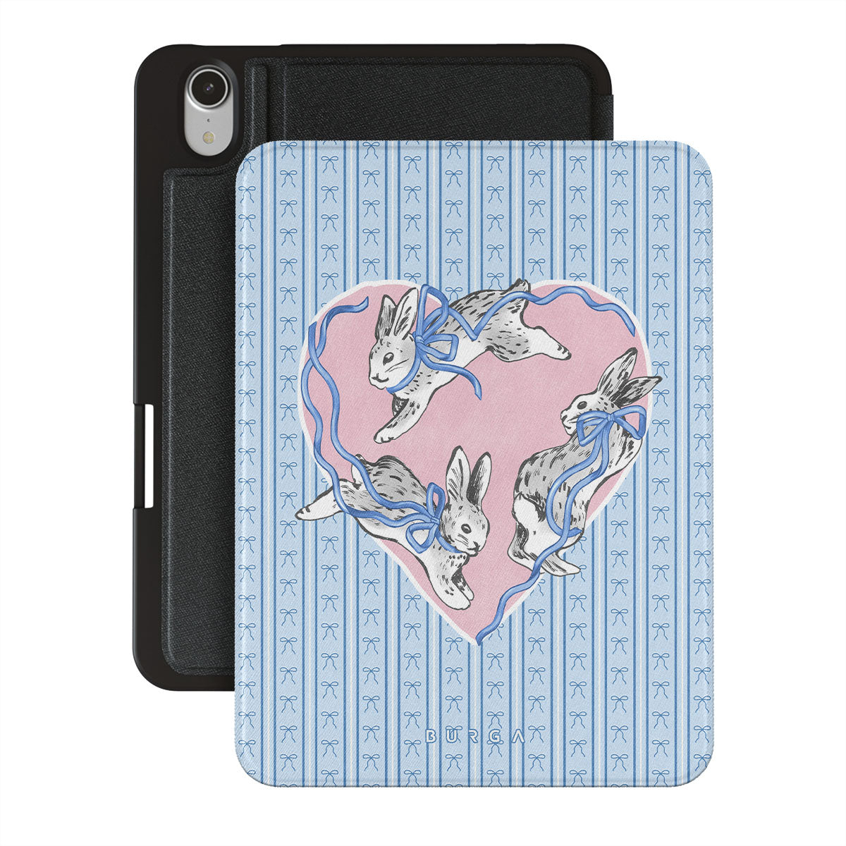 Kenmerken van dit design: witte konijnen, hartenlijst, blauwe strepen