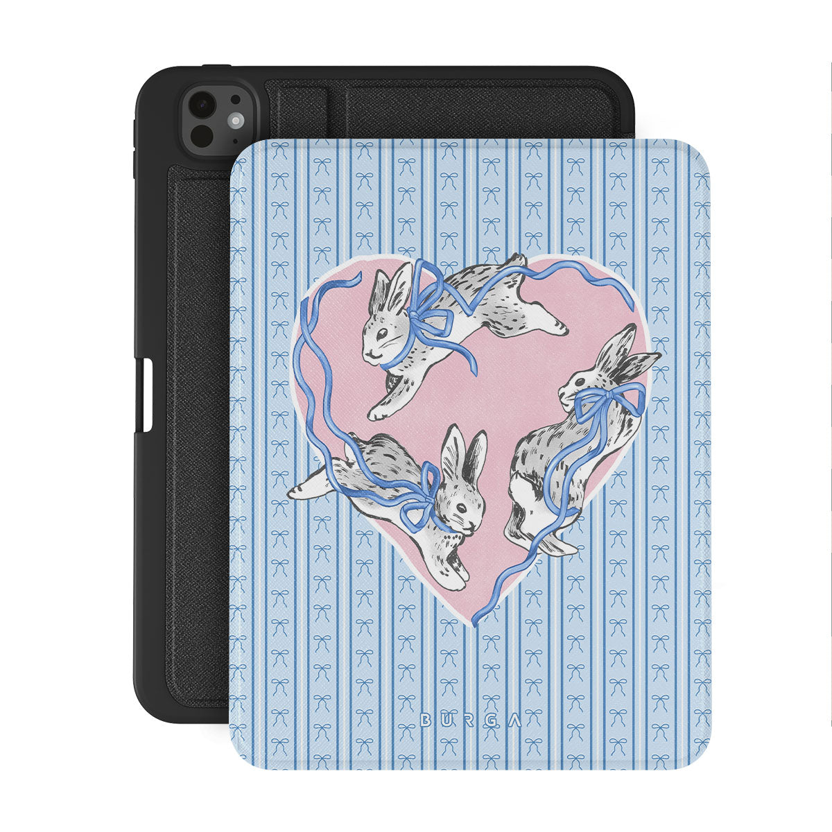 Kenmerken van dit design: witte konijnen, hartenlijst, blauwe strepen
