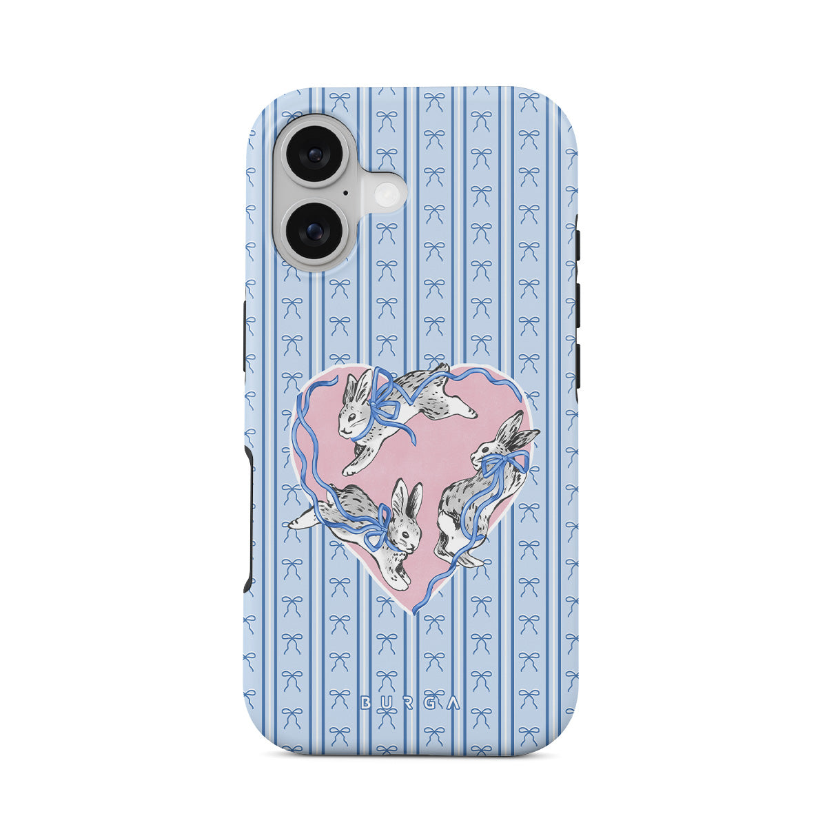 Kenmerken van dit design: witte konijnen, hartenlijst, blauwe strepen