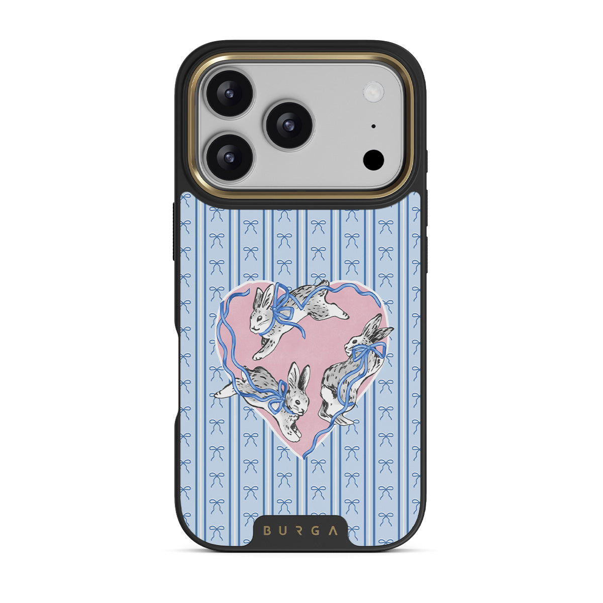 Kenmerken van dit design: witte konijnen, hartenlijst, blauwe strepen