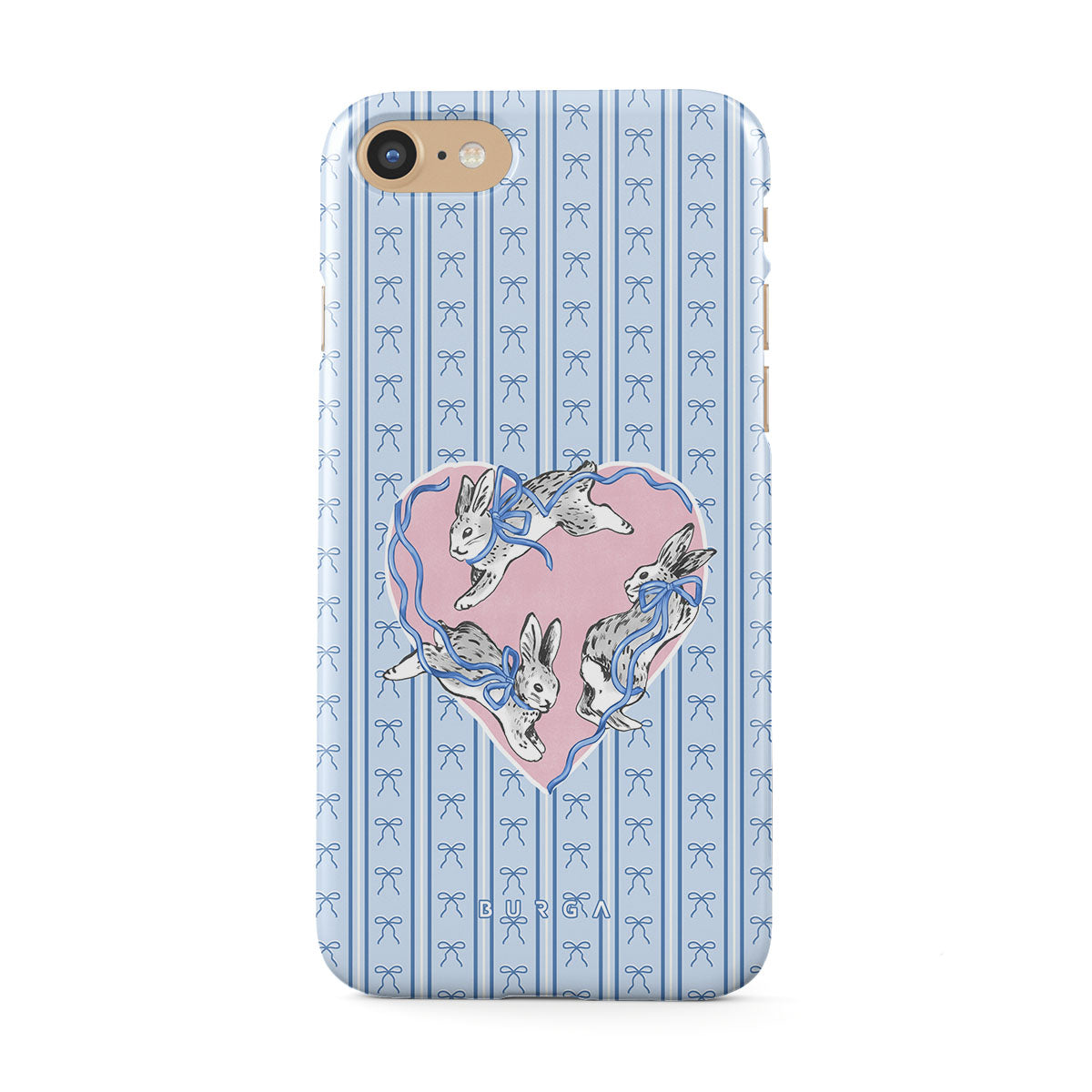 Kenmerken van dit design: witte konijnen, hartenlijst, blauwe strepen