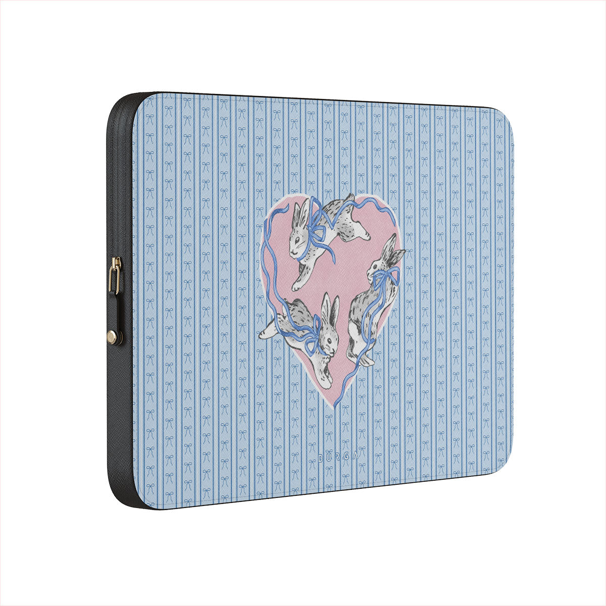 Kenmerken van dit design: witte konijnen, hartenlijst, blauwe strepen