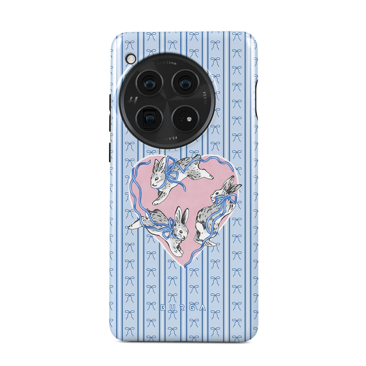 Kenmerken van dit design: witte konijnen, hartenlijst, blauwe strepen