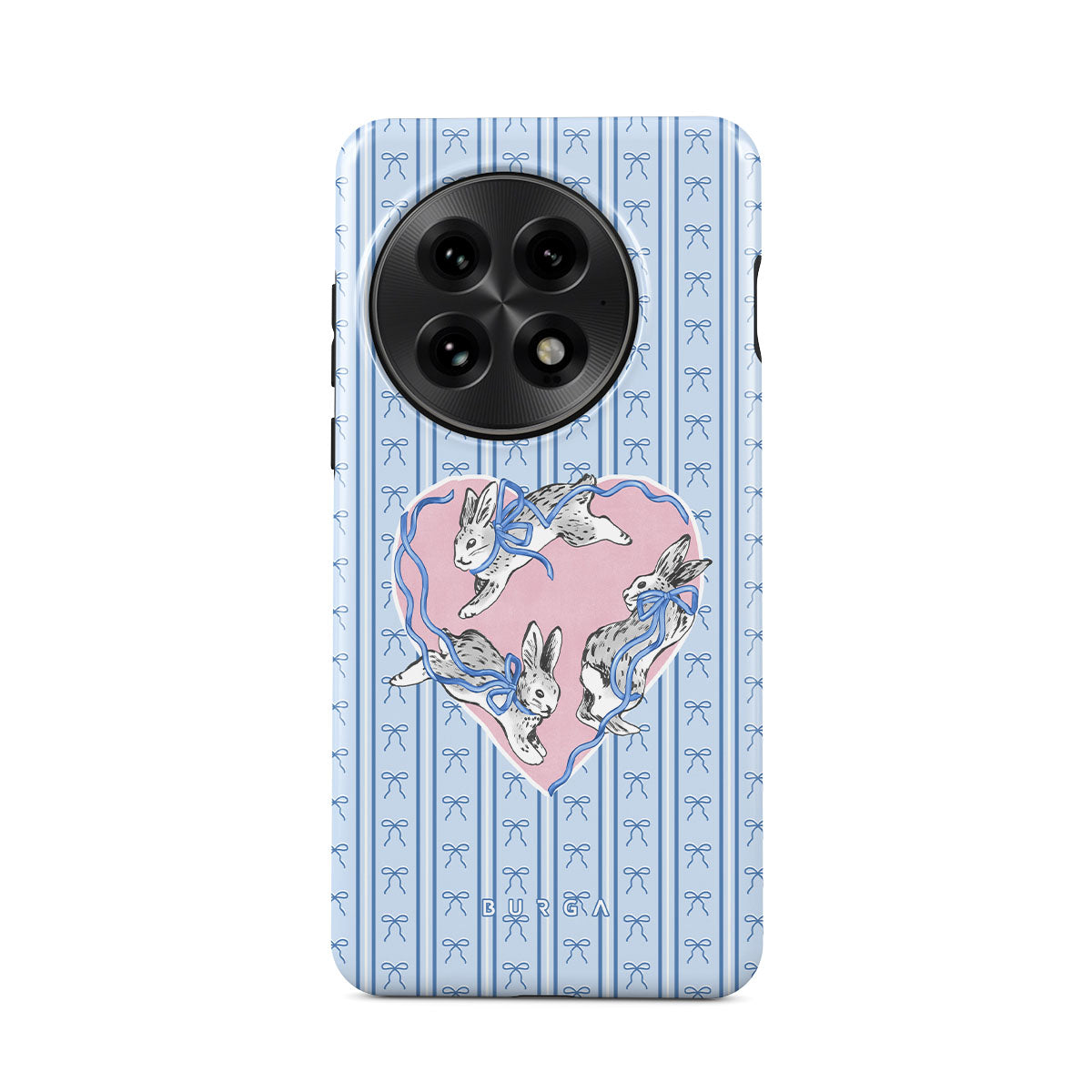 Kenmerken van dit design: witte konijnen, hartenlijst, blauwe strepen