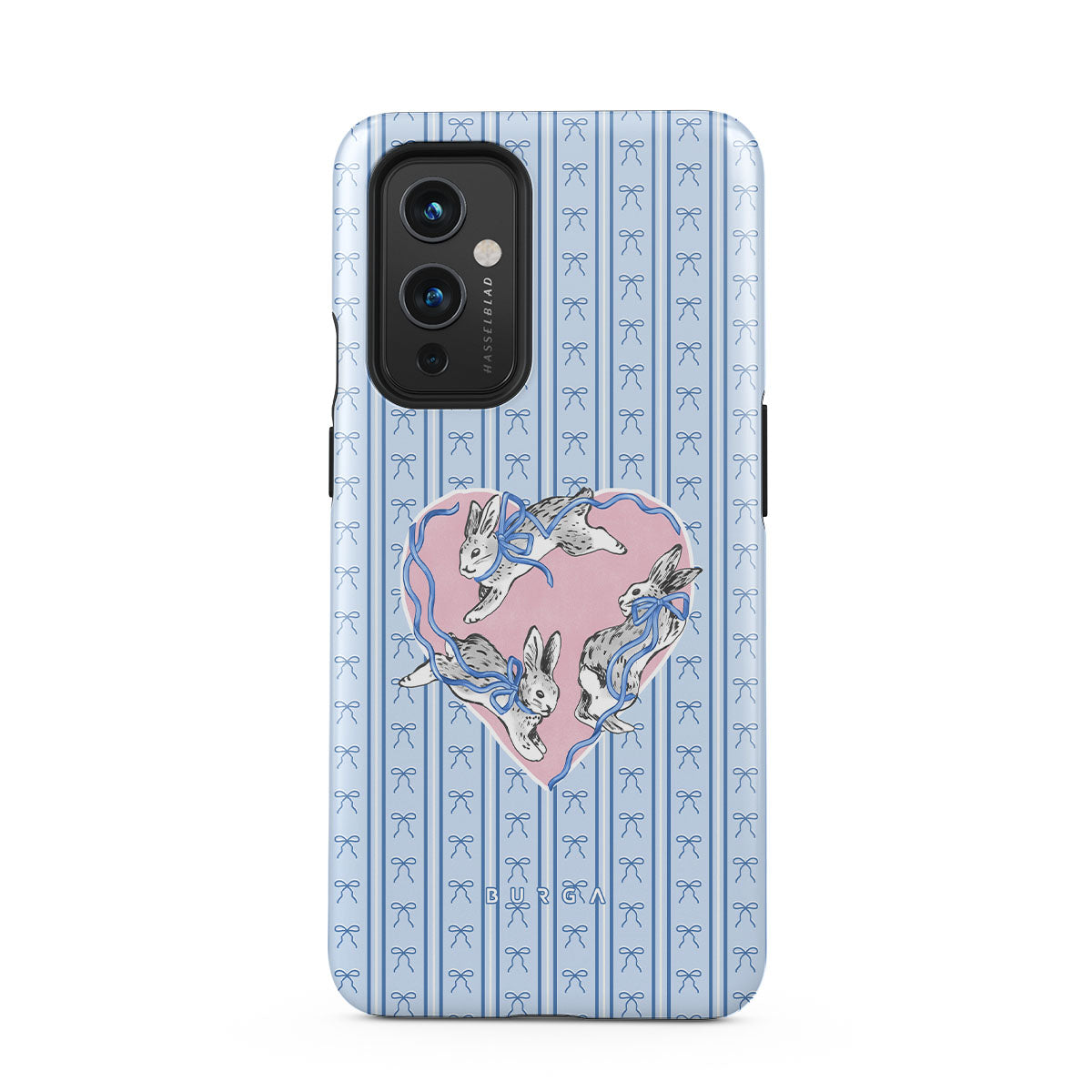 Kenmerken van dit design: witte konijnen, hartenlijst, blauwe strepen
