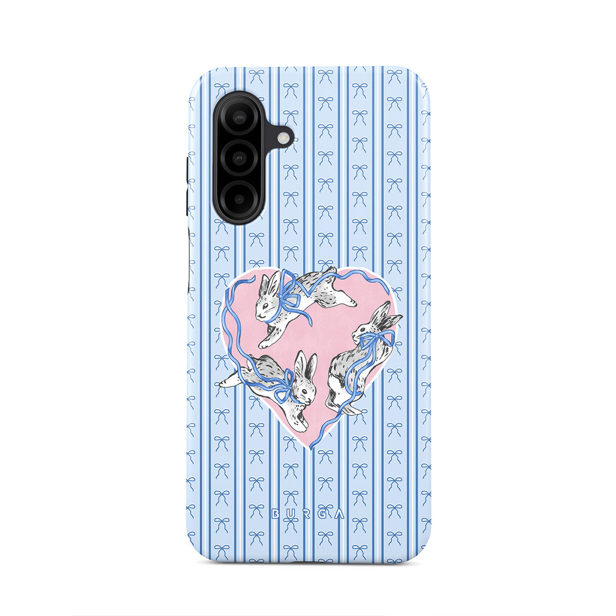Kenmerken van dit design: witte konijnen, hartenlijst, blauwe strepen