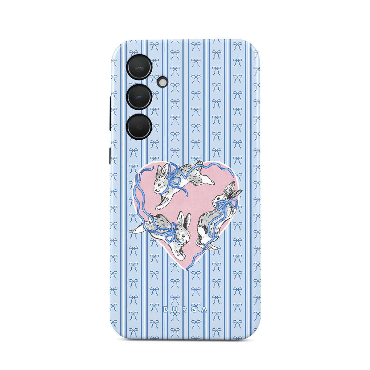 Kenmerken van dit design: witte konijnen, hartenlijst, blauwe strepen
