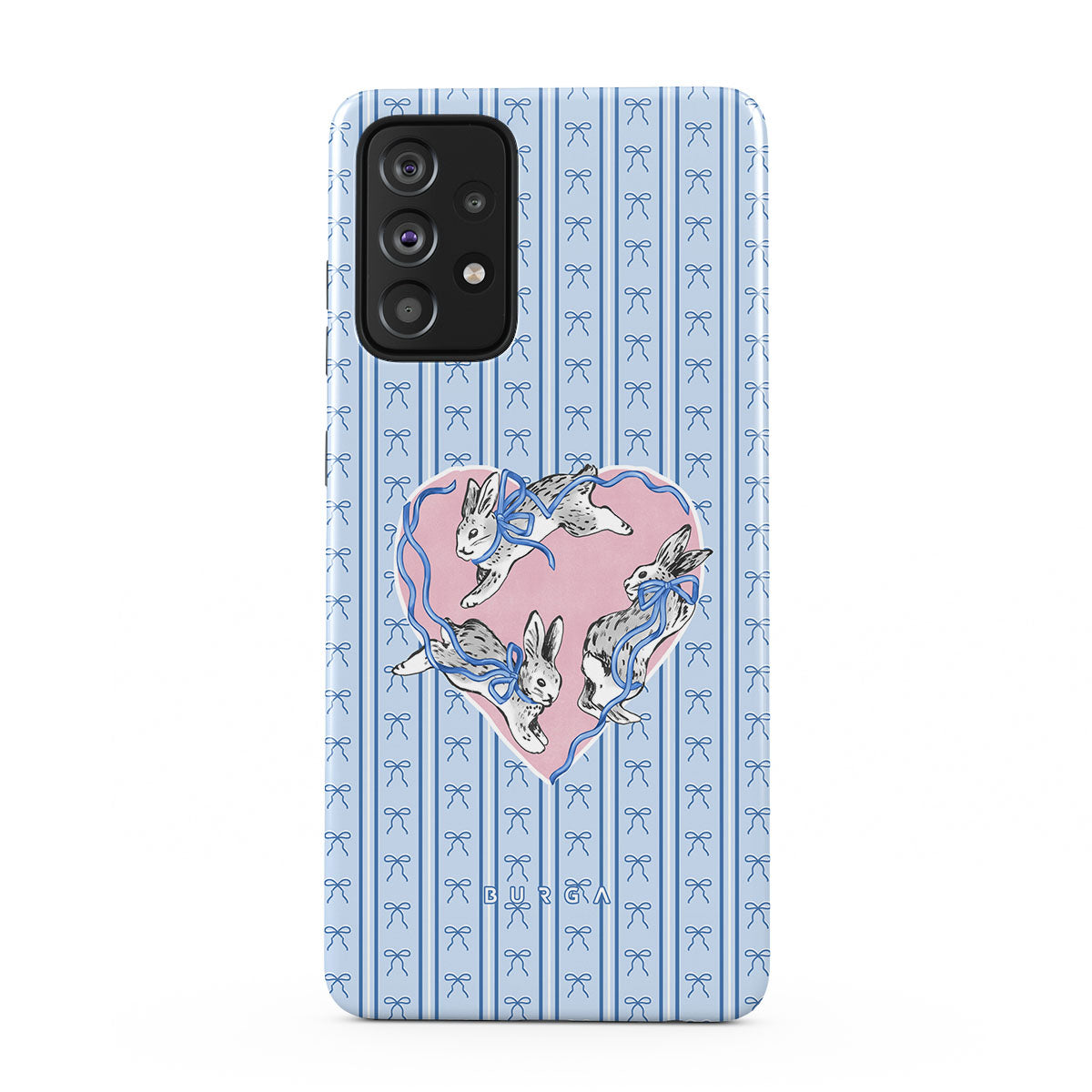Kenmerken van dit design: witte konijnen, hartenlijst, blauwe strepen