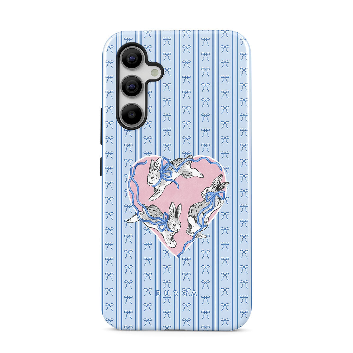 Kenmerken van dit design: witte konijnen, hartenlijst, blauwe strepen