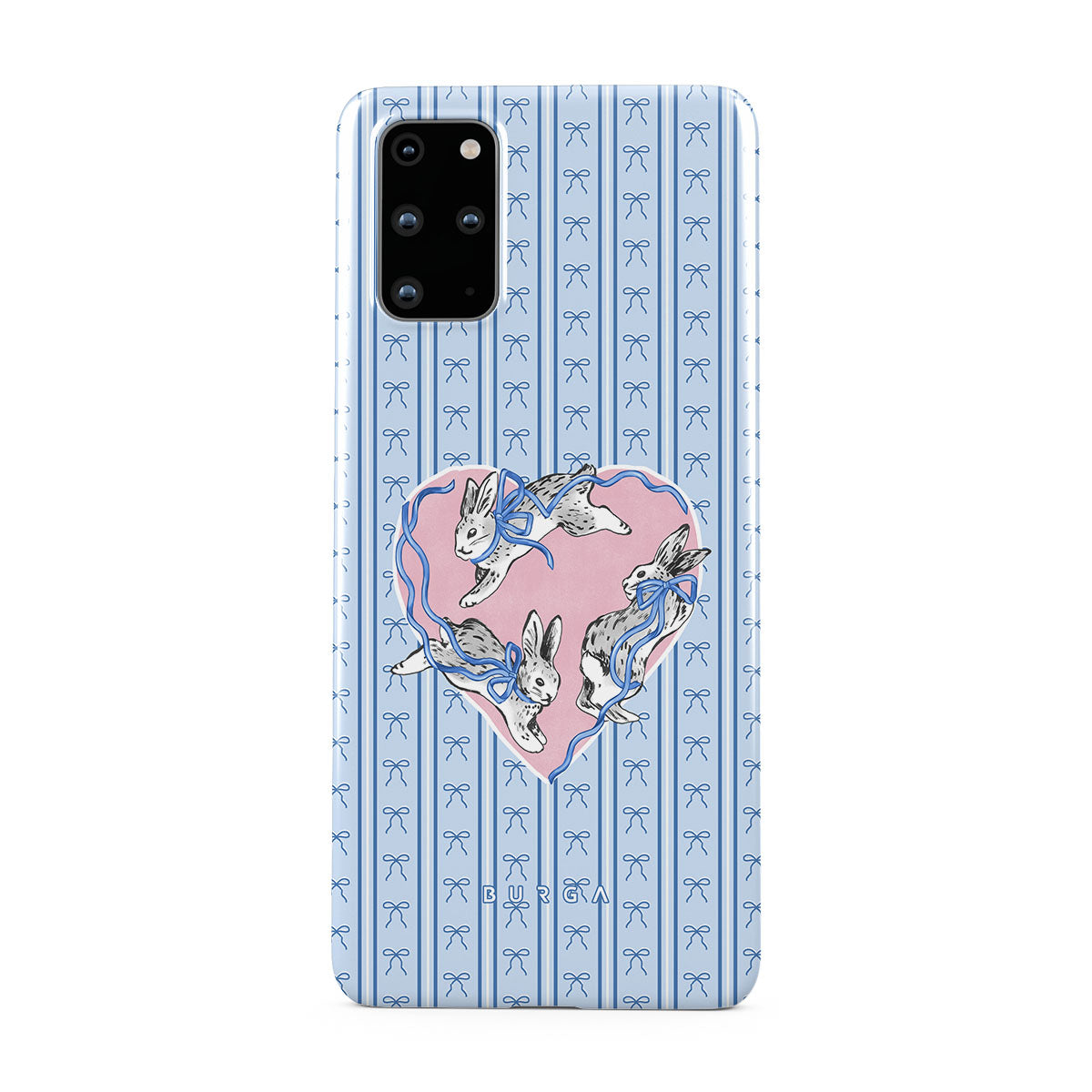 Kenmerken van dit design: witte konijnen, hartenlijst, blauwe strepen