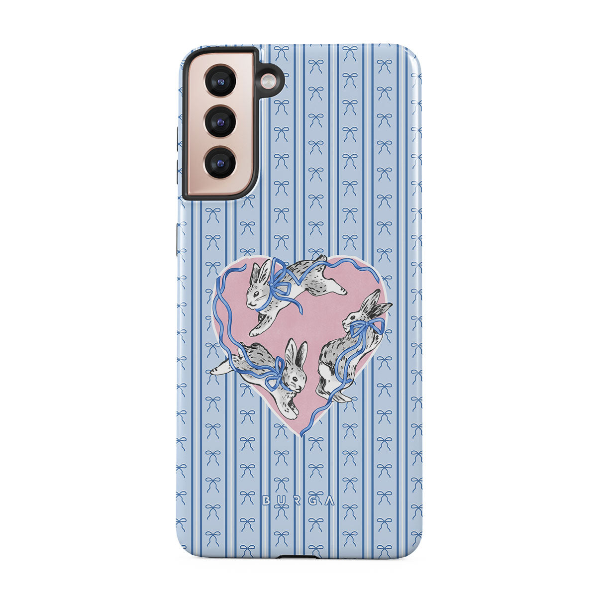Kenmerken van dit design: witte konijnen, hartenlijst, blauwe strepen