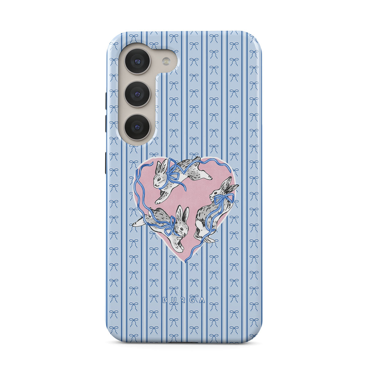 Kenmerken van dit design: witte konijnen, hartenlijst, blauwe strepen