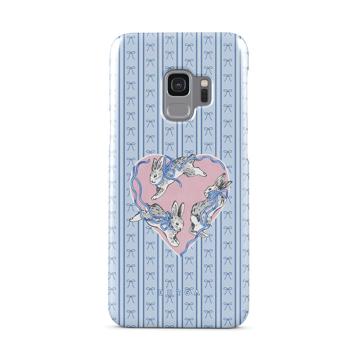 Kenmerken van dit design: witte konijnen, hartenlijst, blauwe strepen