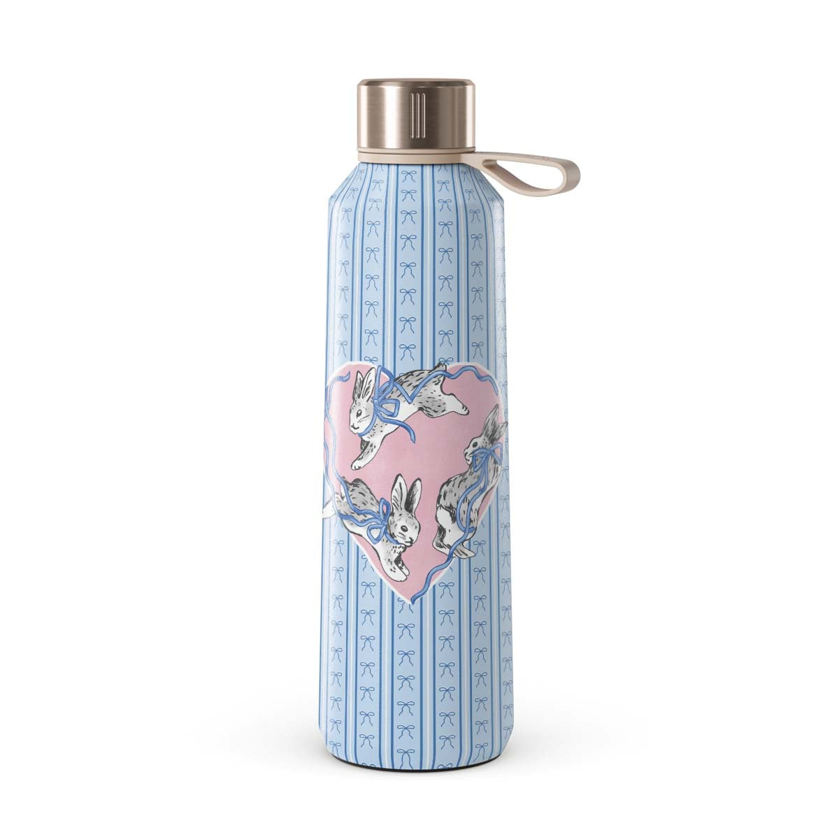 Kenmerken van dit design: witte konijnen, hartenlijst, blauwe strepen