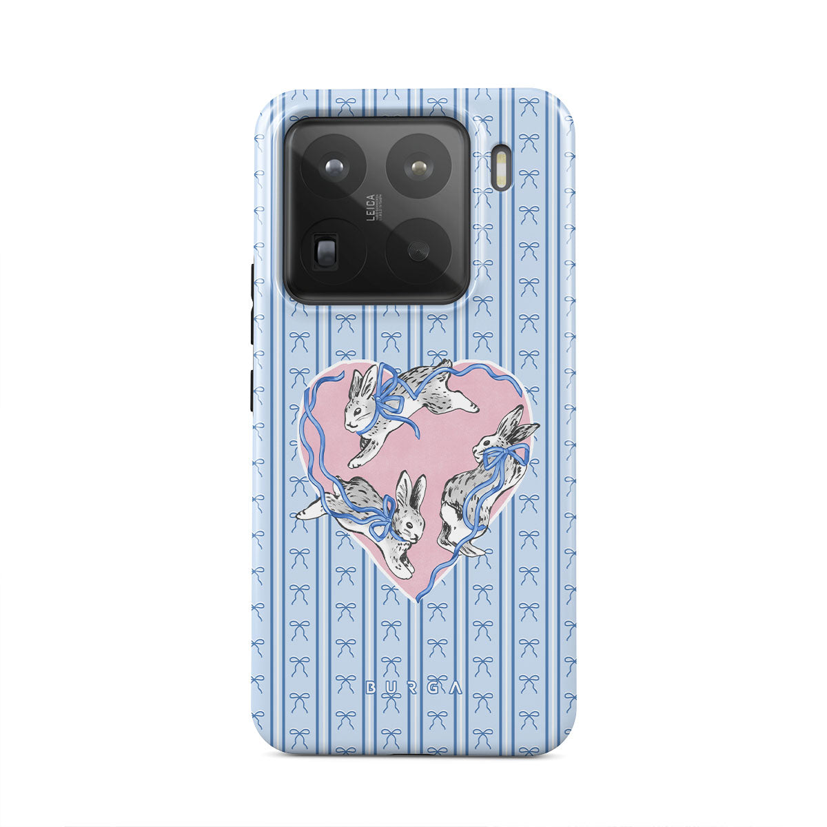 Kenmerken van dit design: witte konijnen, hartenlijst, blauwe strepen