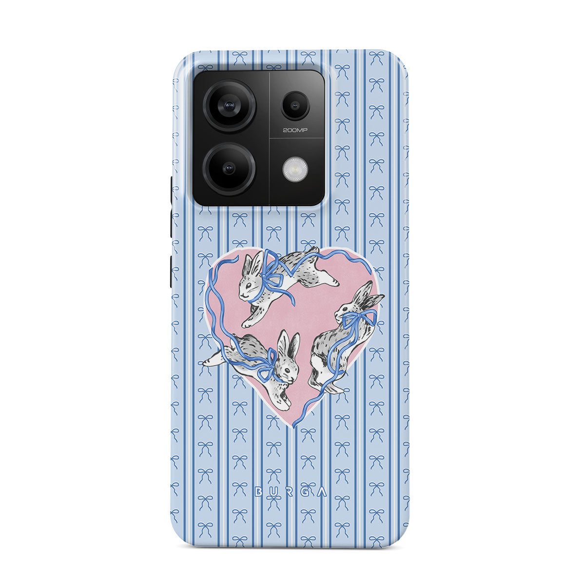 Kenmerken van dit design: witte konijnen, hartenlijst, blauwe strepen