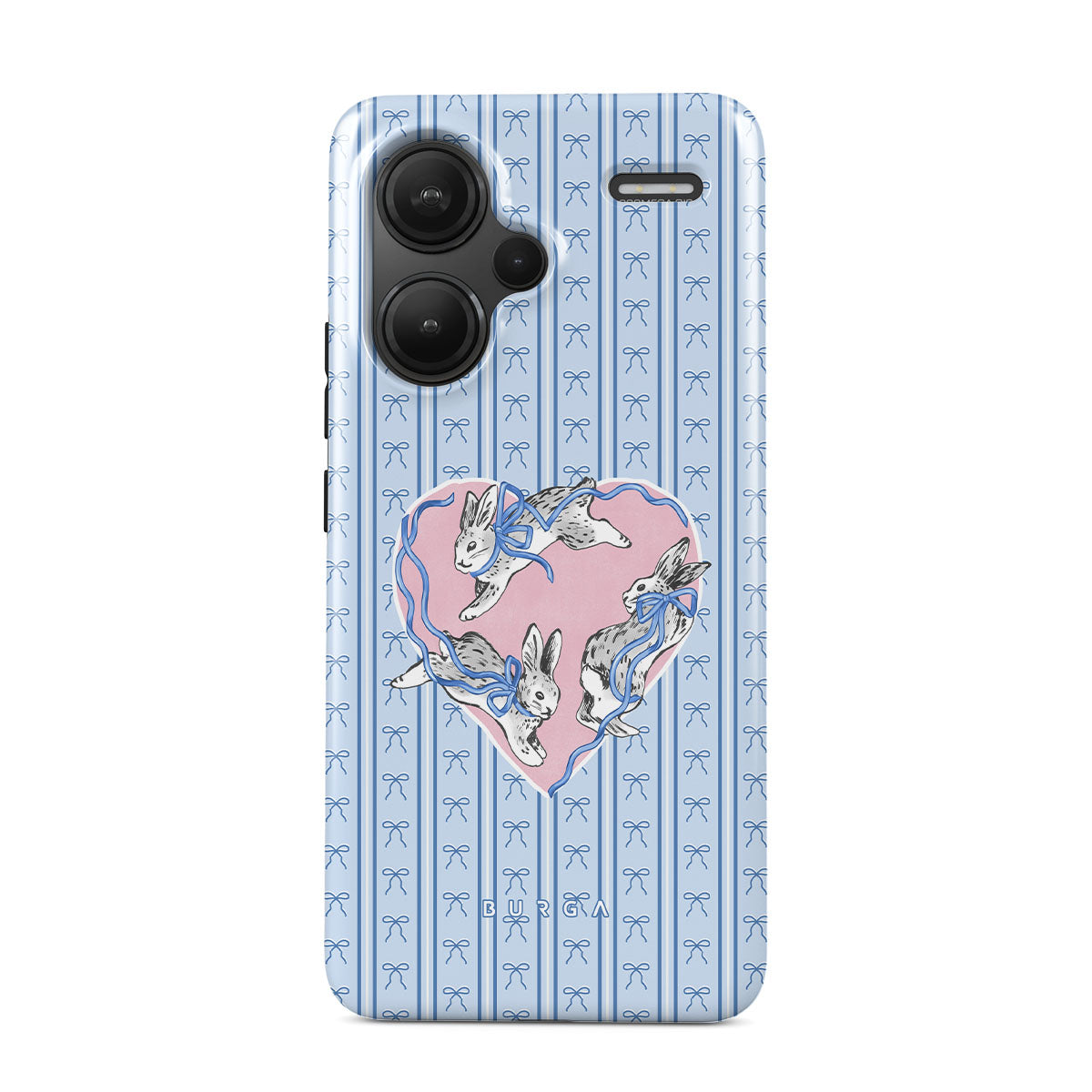 Kenmerken van dit design: witte konijnen, hartenlijst, blauwe strepen