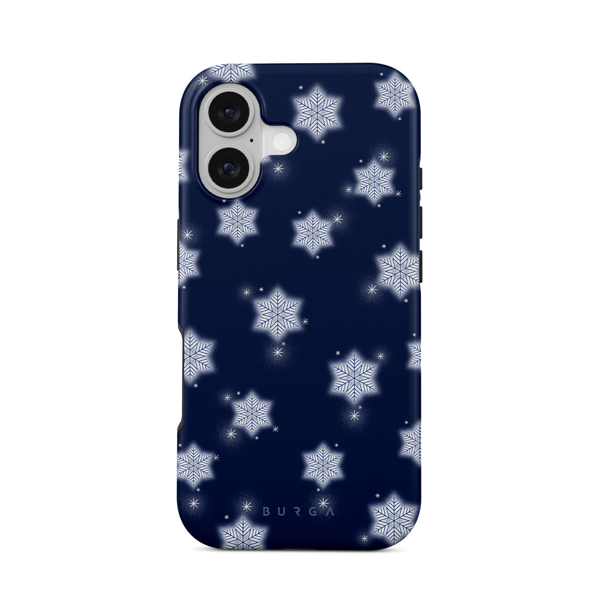 Kenmerken van dit design: witte sneeuwvlokken, marineblauwe achtergrond, winter sneeuwvlokkenpatroon, geometrische sneeuwvlokken, klassiek winterontwerp
