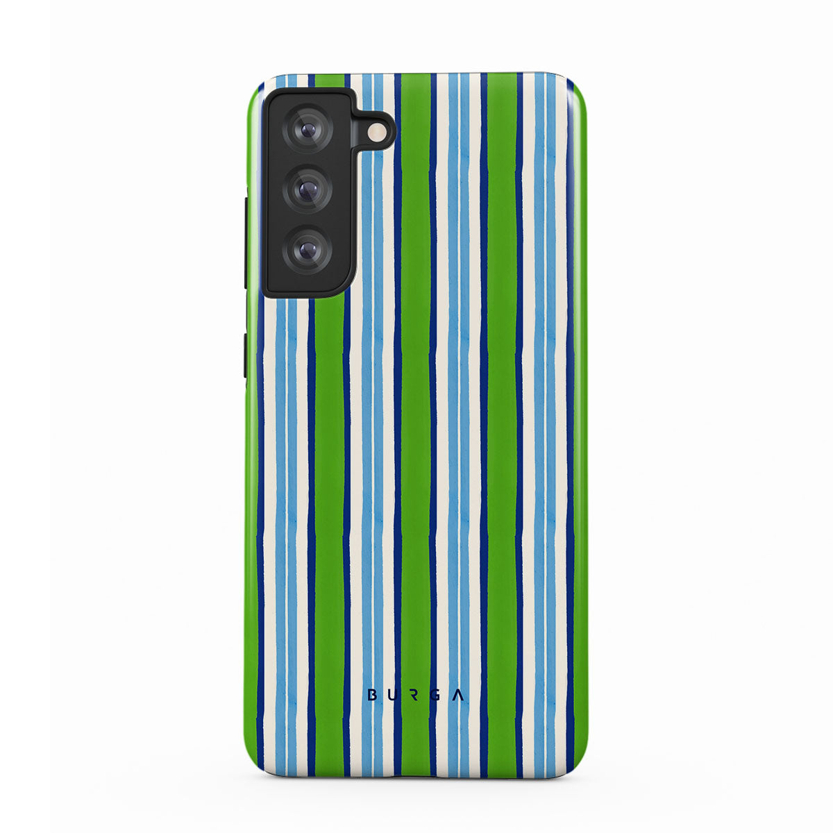 Kenmerken van dit design: groene, blauwe en witte verticale strepen