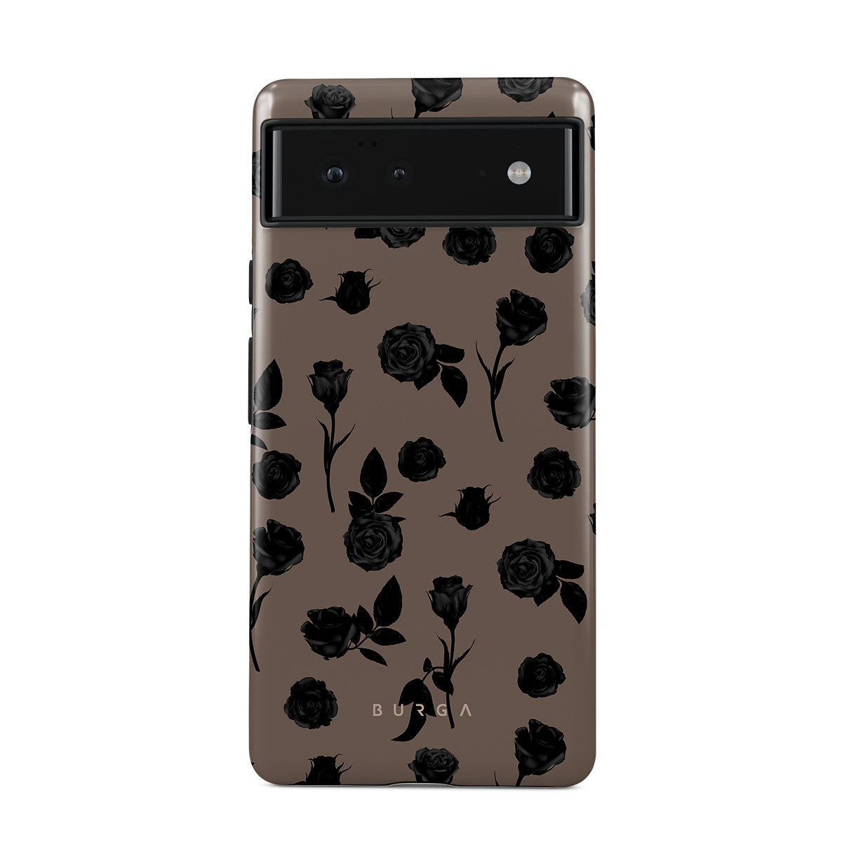 Dit ontwerp bevat: zwarte rozen, aardse tinten, bloemdetails, donkere bloemen.