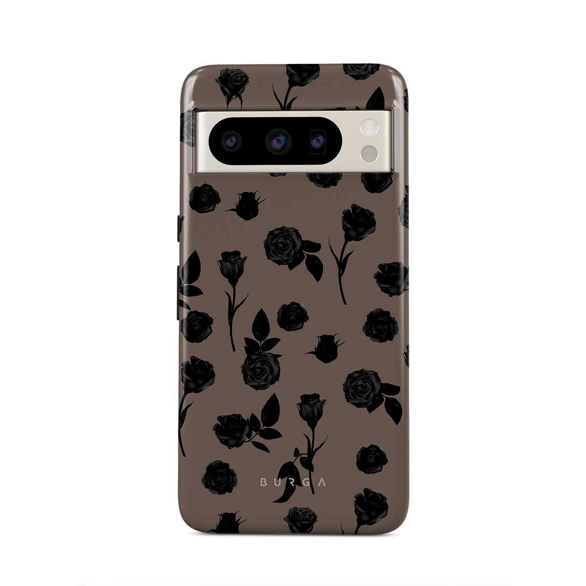 Dit ontwerp bevat: zwarte rozen, aardse tinten, bloemdetails, donkere bloemen.