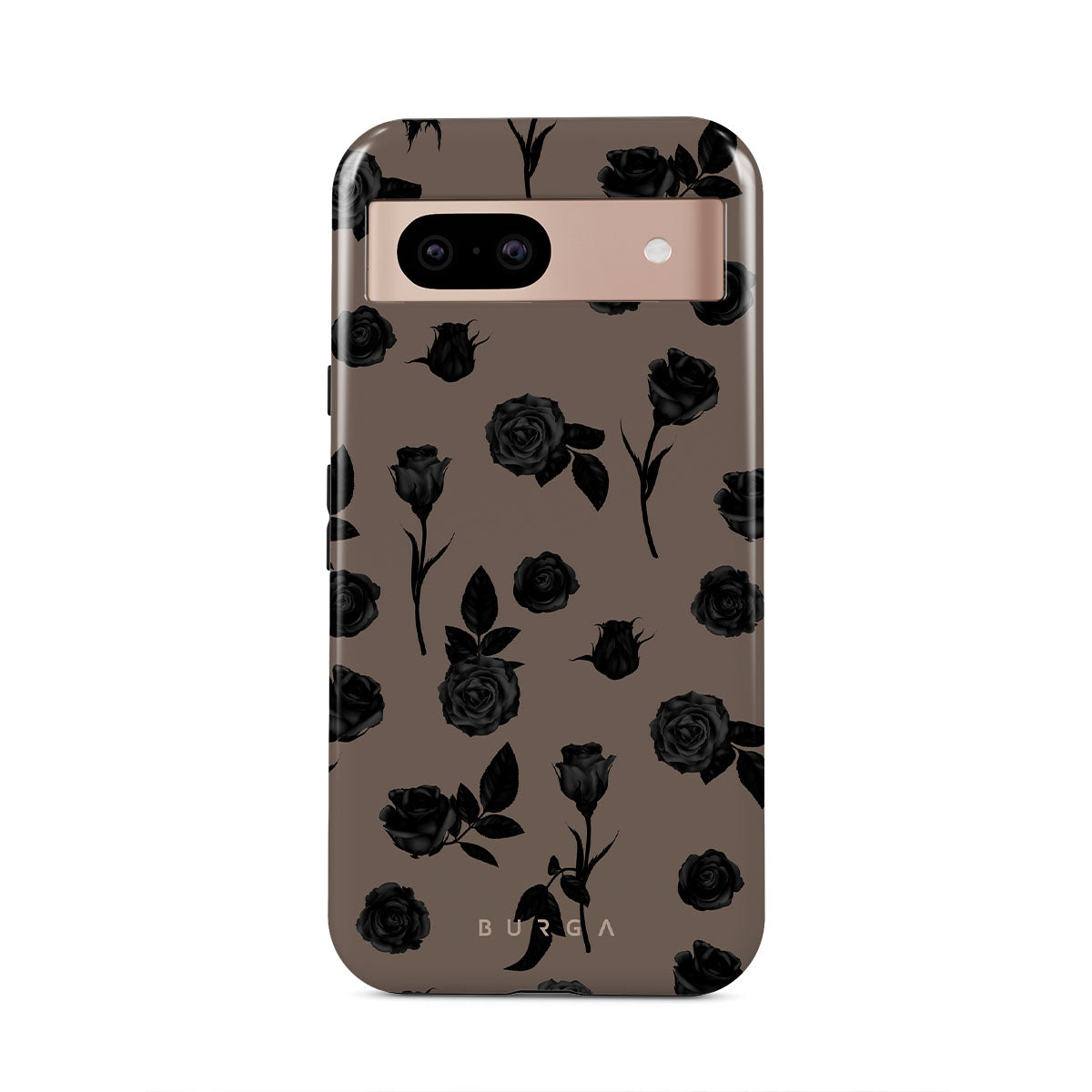 Dit ontwerp bevat: zwarte rozen, aardse tinten, bloemdetails, donkere bloemen.