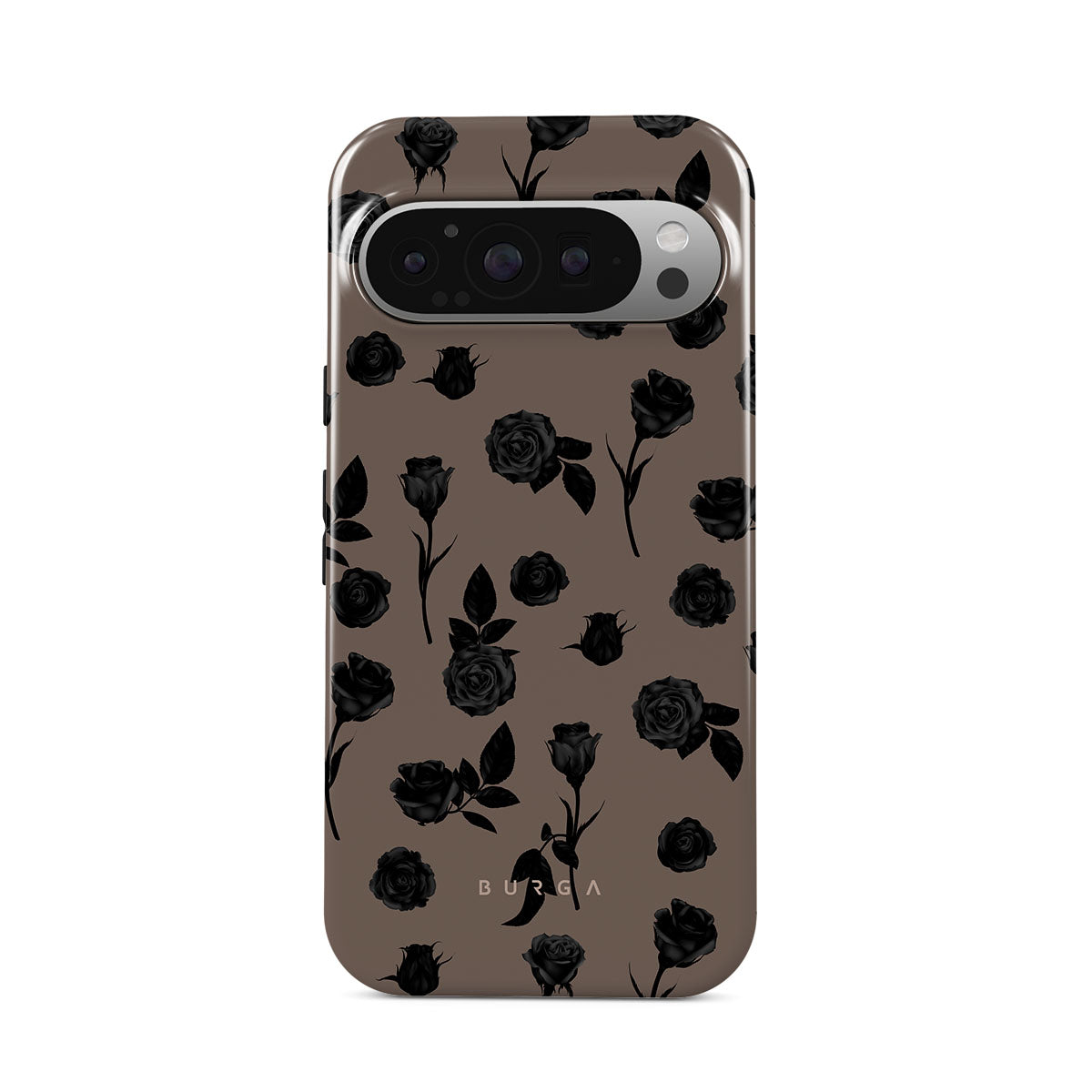 Dit ontwerp bevat: zwarte rozen, aardse tinten, bloemdetails, donkere bloemen.