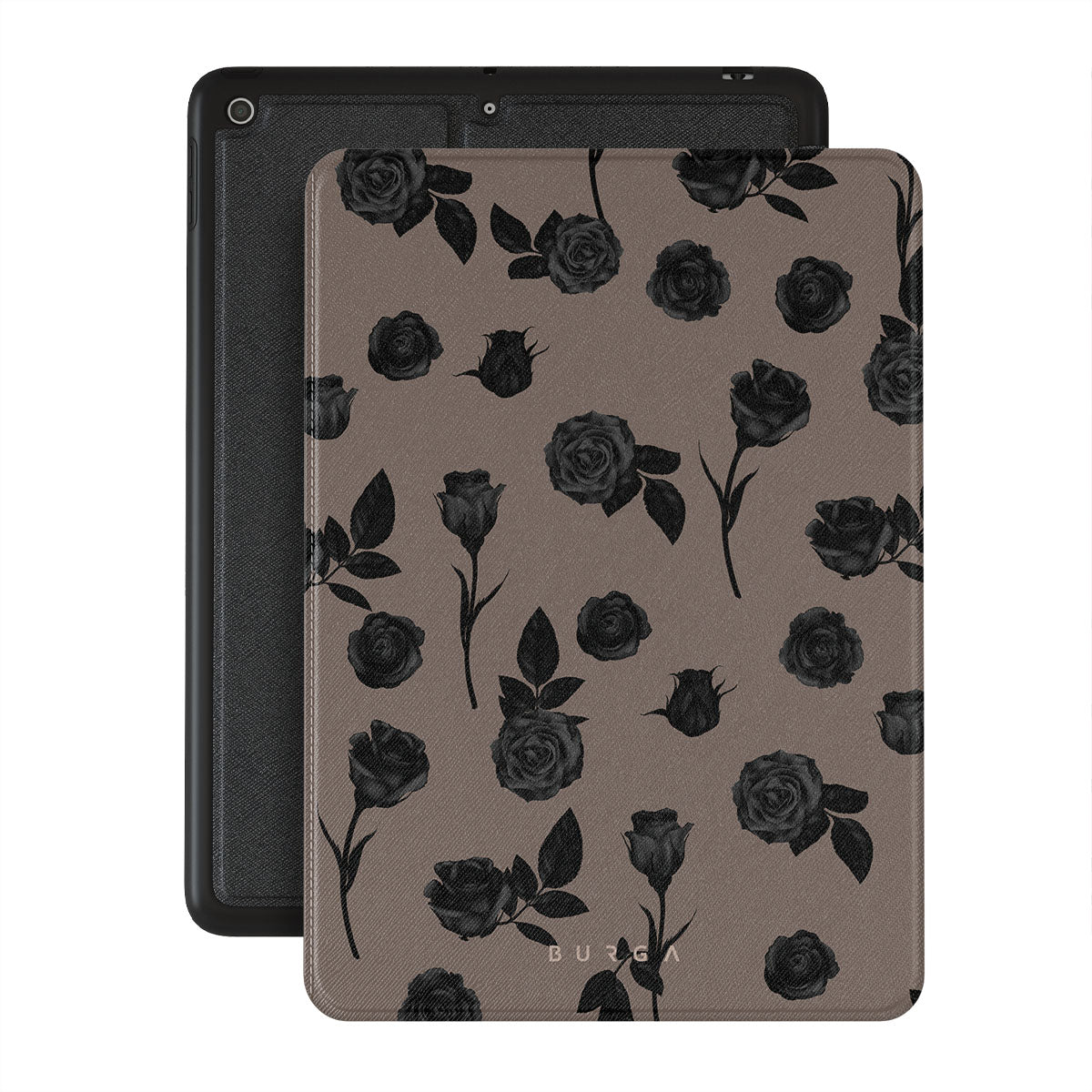 Dit ontwerp bevat: zwarte rozen, aardse tinten, bloemdetails, donkere bloemen.