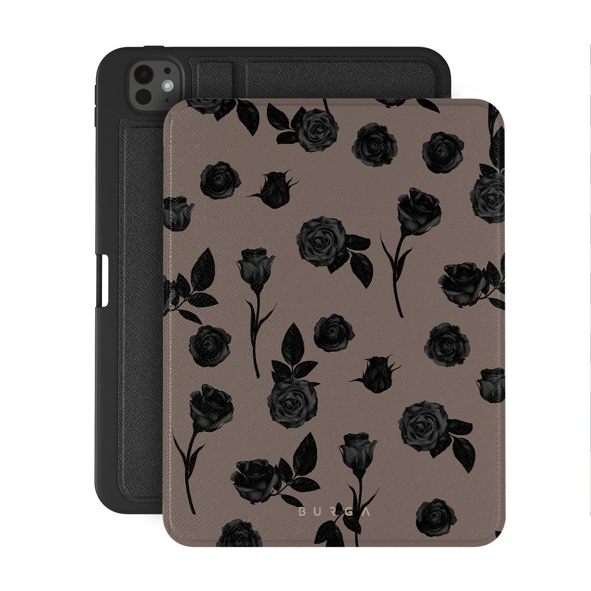 Dit ontwerp bevat: zwarte rozen, aardse tinten, bloemdetails, donkere bloemen.