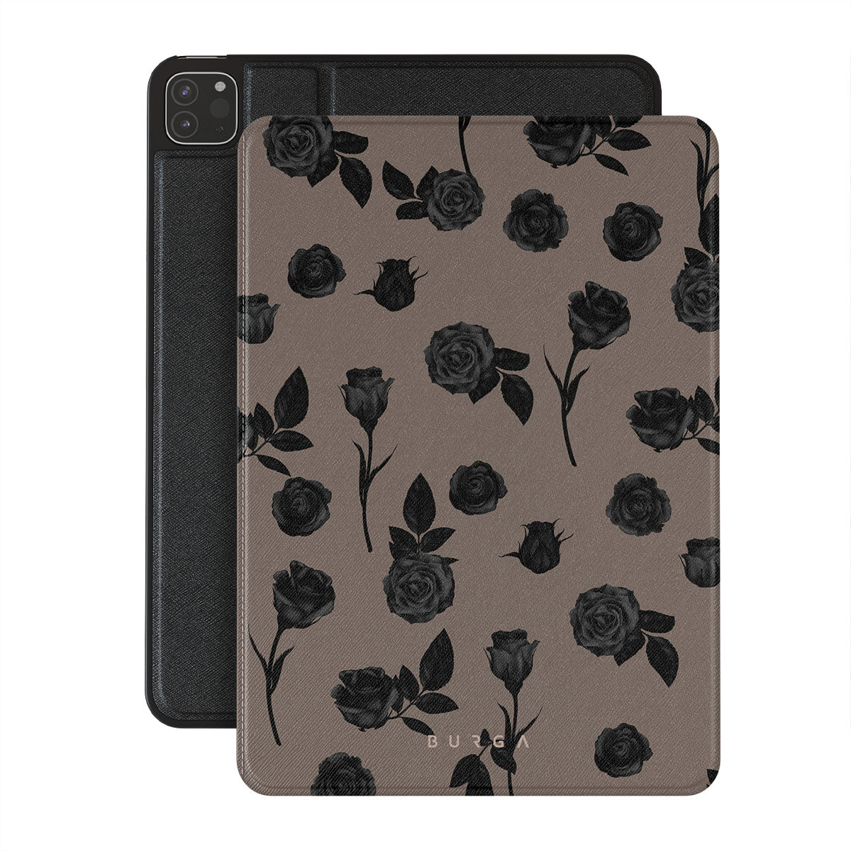 Dit ontwerp bevat: zwarte rozen, aardse tinten, bloemdetails, donkere bloemen.