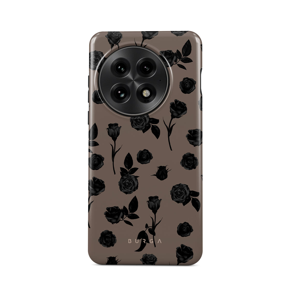 Dit ontwerp bevat: zwarte rozen, aardse tinten, bloemdetails, donkere bloemen.