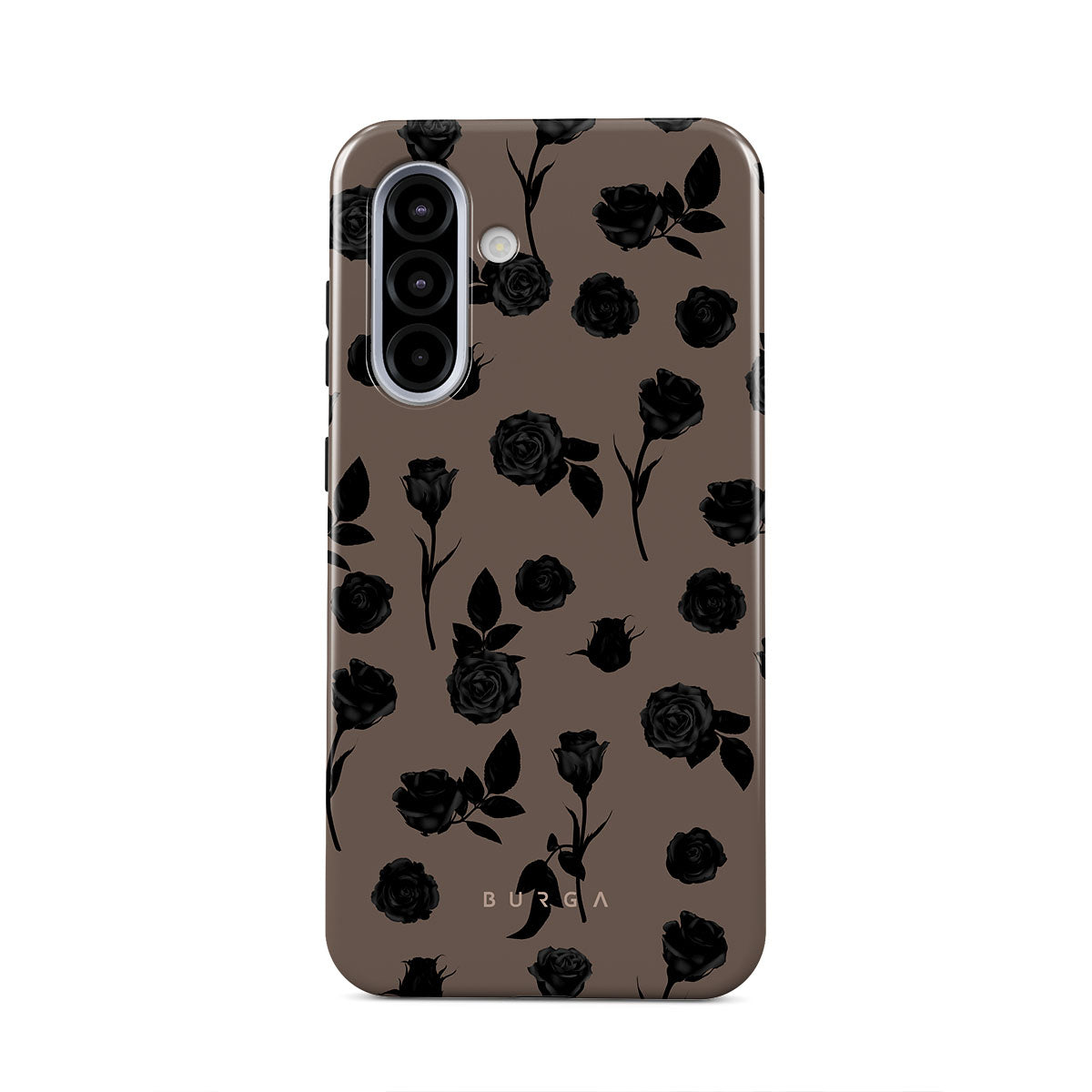 Dit ontwerp bevat: zwarte rozen, aardse tinten, bloemdetails, donkere bloemen.