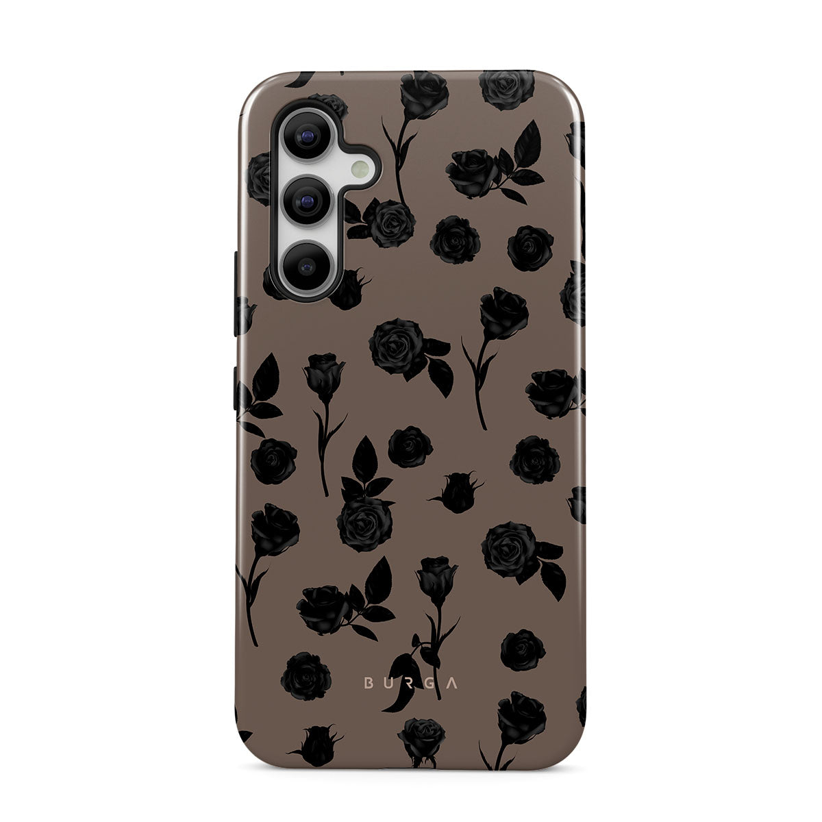 Dit ontwerp bevat: zwarte rozen, aardse tinten, bloemdetails, donkere bloemen.