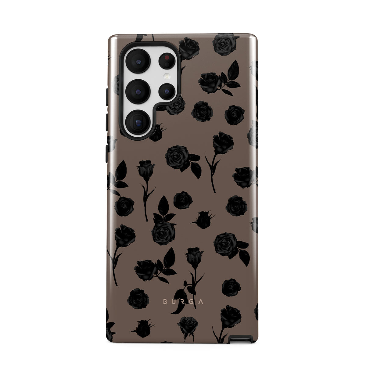 Dit ontwerp bevat: zwarte rozen, aardse tinten, bloemdetails, donkere bloemen.