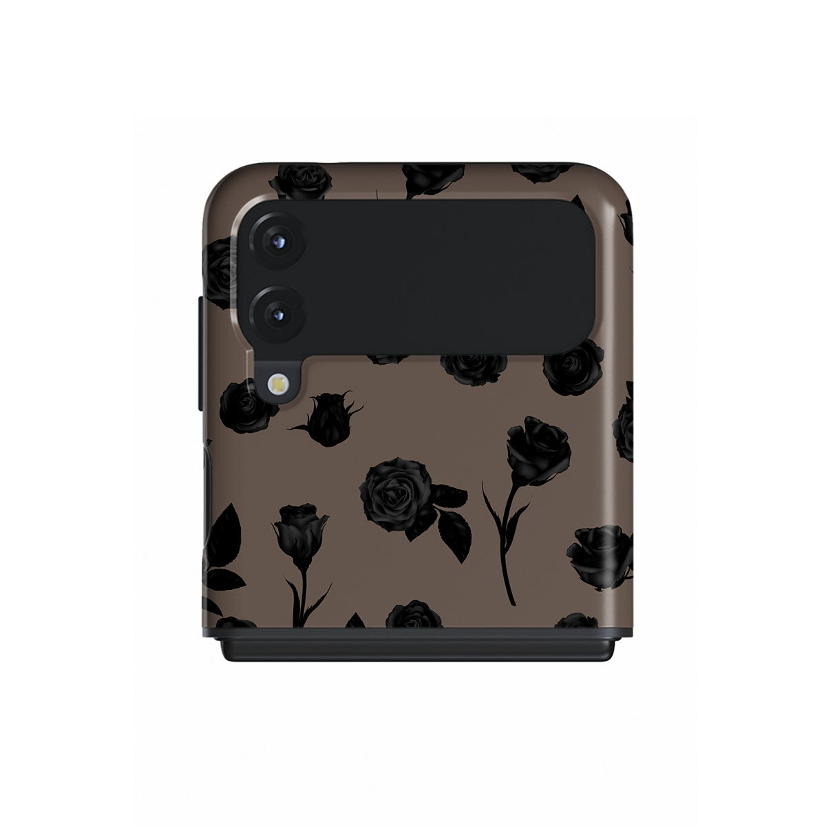 Dit ontwerp bevat: zwarte rozen, aardse tinten, bloemdetails, donkere bloemen.