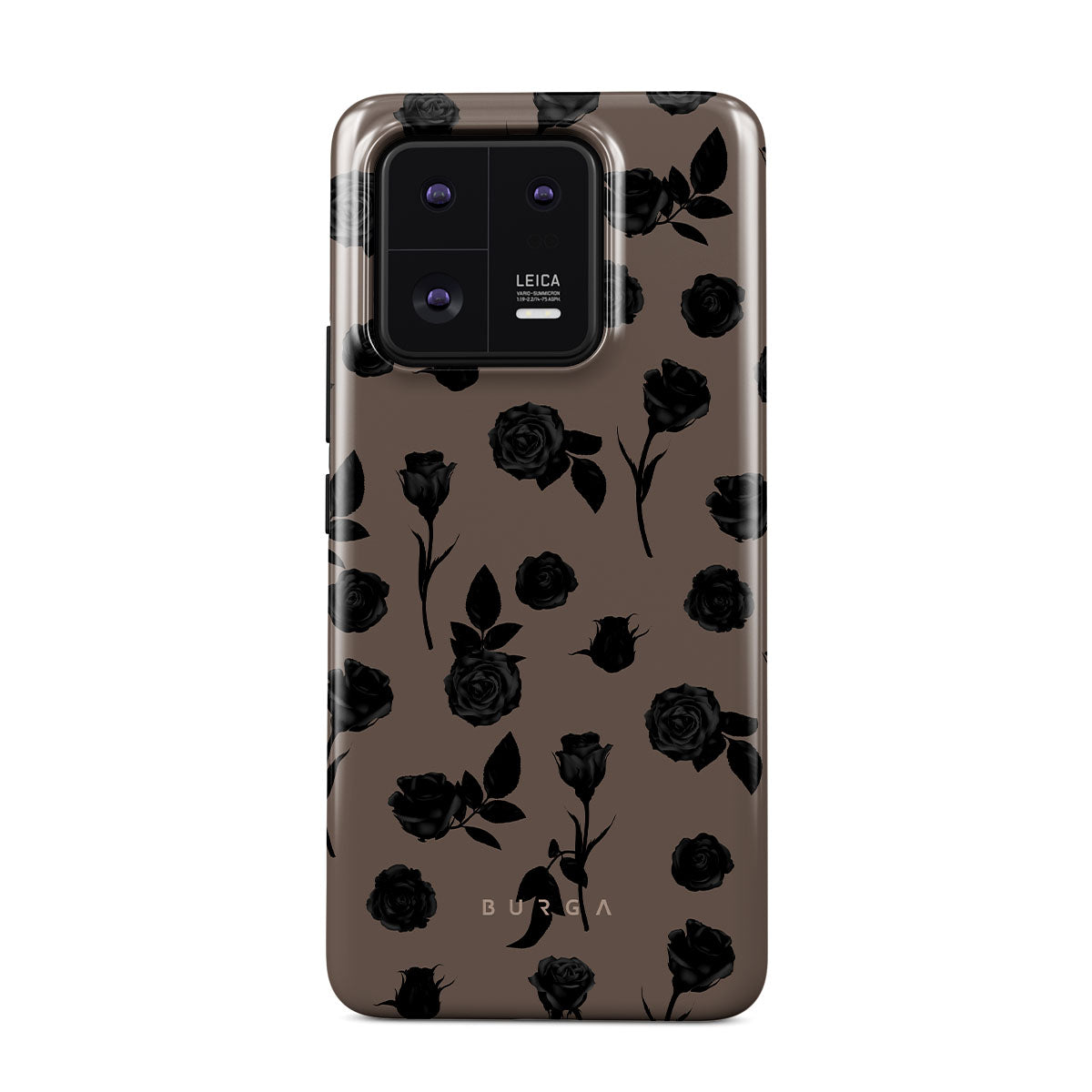 Dit ontwerp bevat: zwarte rozen, aardse tinten, bloemdetails, donkere bloemen.