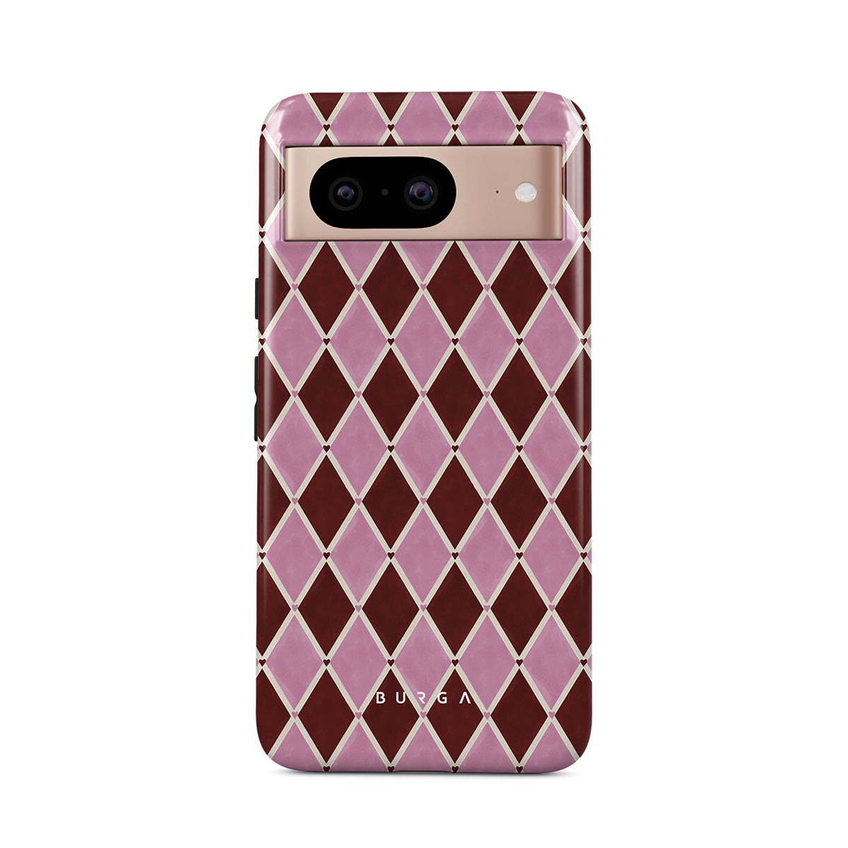 Kenmerken van dit design: harlekijnpatroon, roze ruiten, diep rode achtergrond
