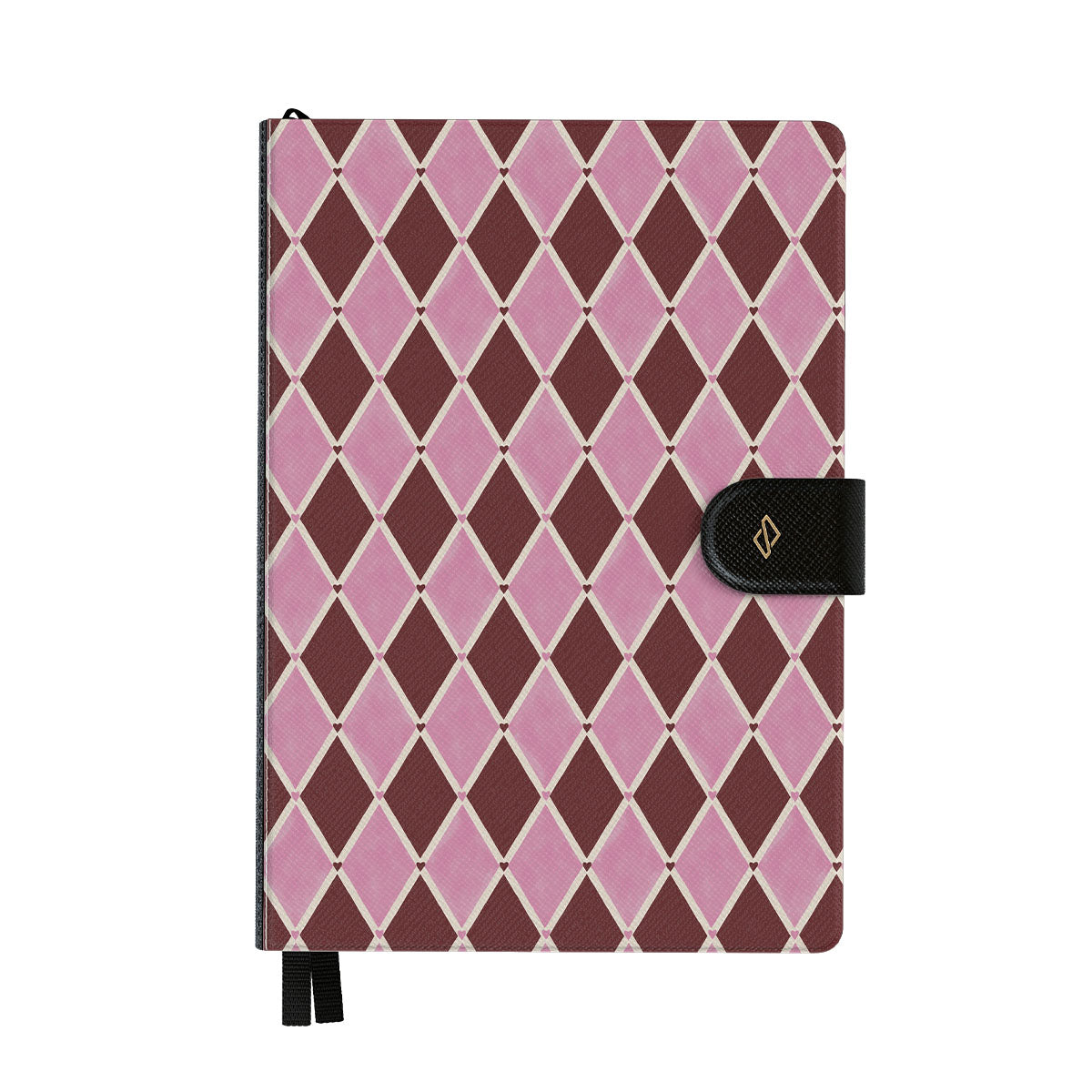 Kenmerken van dit design: harlekijnpatroon, roze ruiten, diep rode achtergrond