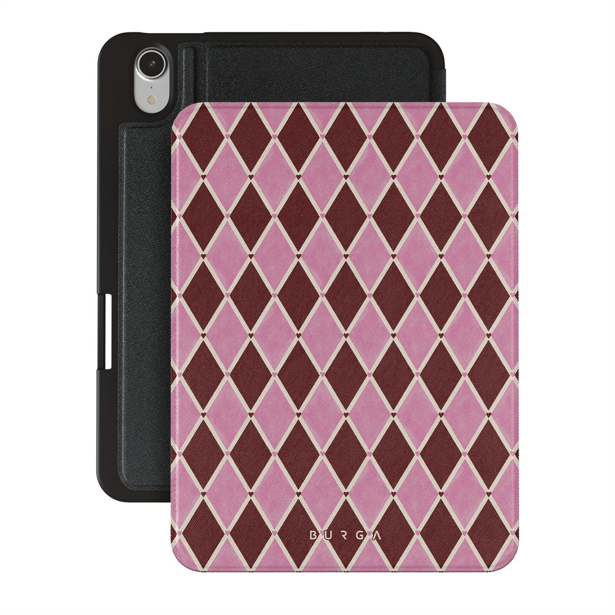 Kenmerken van dit design: harlekijnpatroon, roze ruiten, diep rode achtergrond