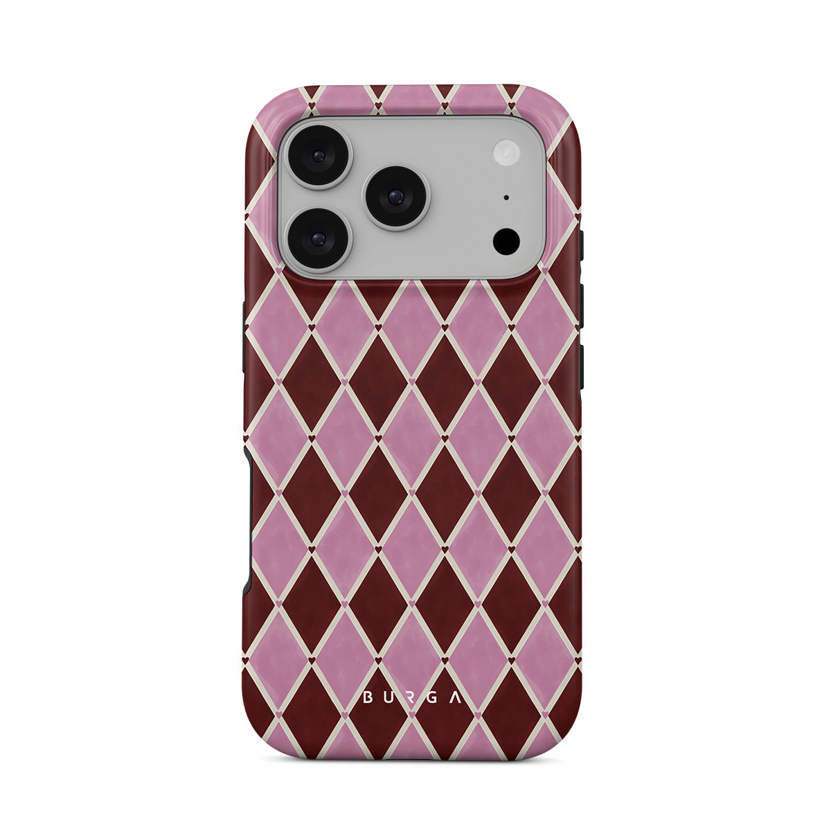 Kenmerken van dit design: harlekijnpatroon, roze ruiten, diep rode achtergrond