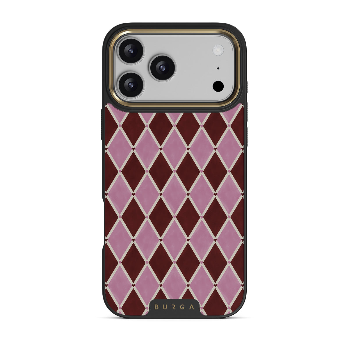 Kenmerken van dit design: harlekijnpatroon, roze ruiten, diep rode achtergrond