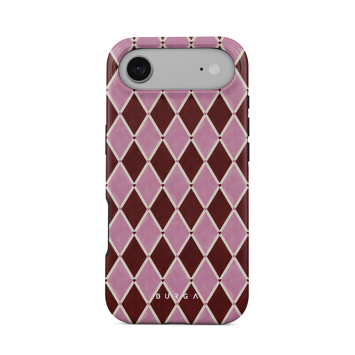 Kenmerken van dit design: harlekijnpatroon, roze ruiten, diep rode achtergrond