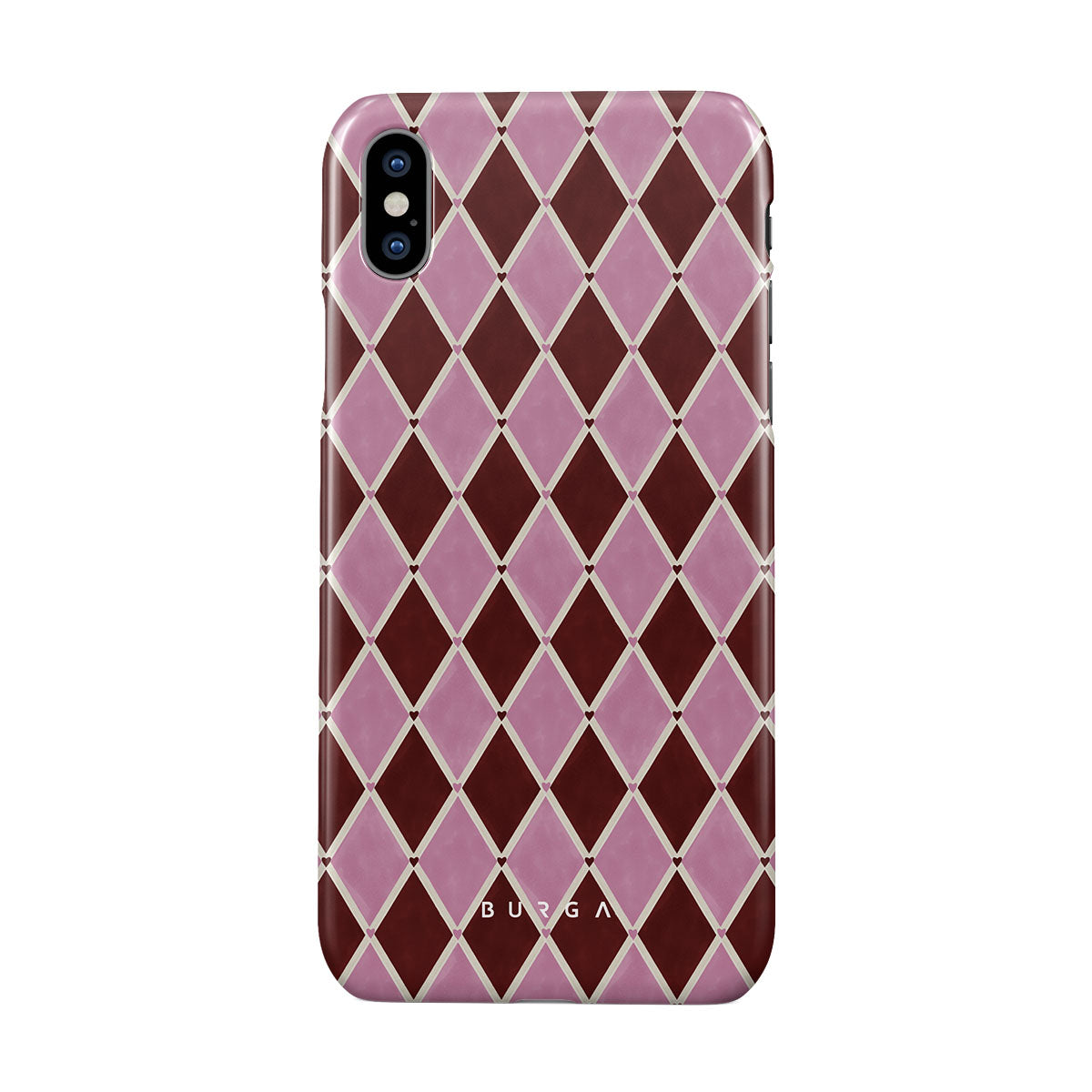 Kenmerken van dit design: harlekijnpatroon, roze ruiten, diep rode achtergrond