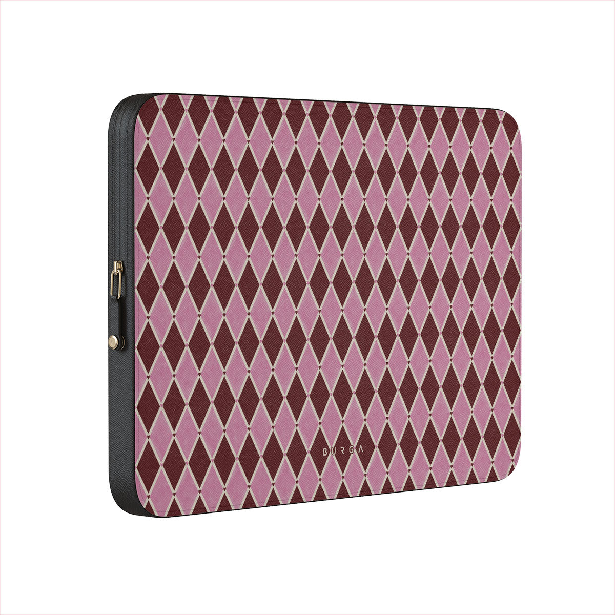Kenmerken van dit design: harlekijnpatroon, roze ruiten, diep rode achtergrond