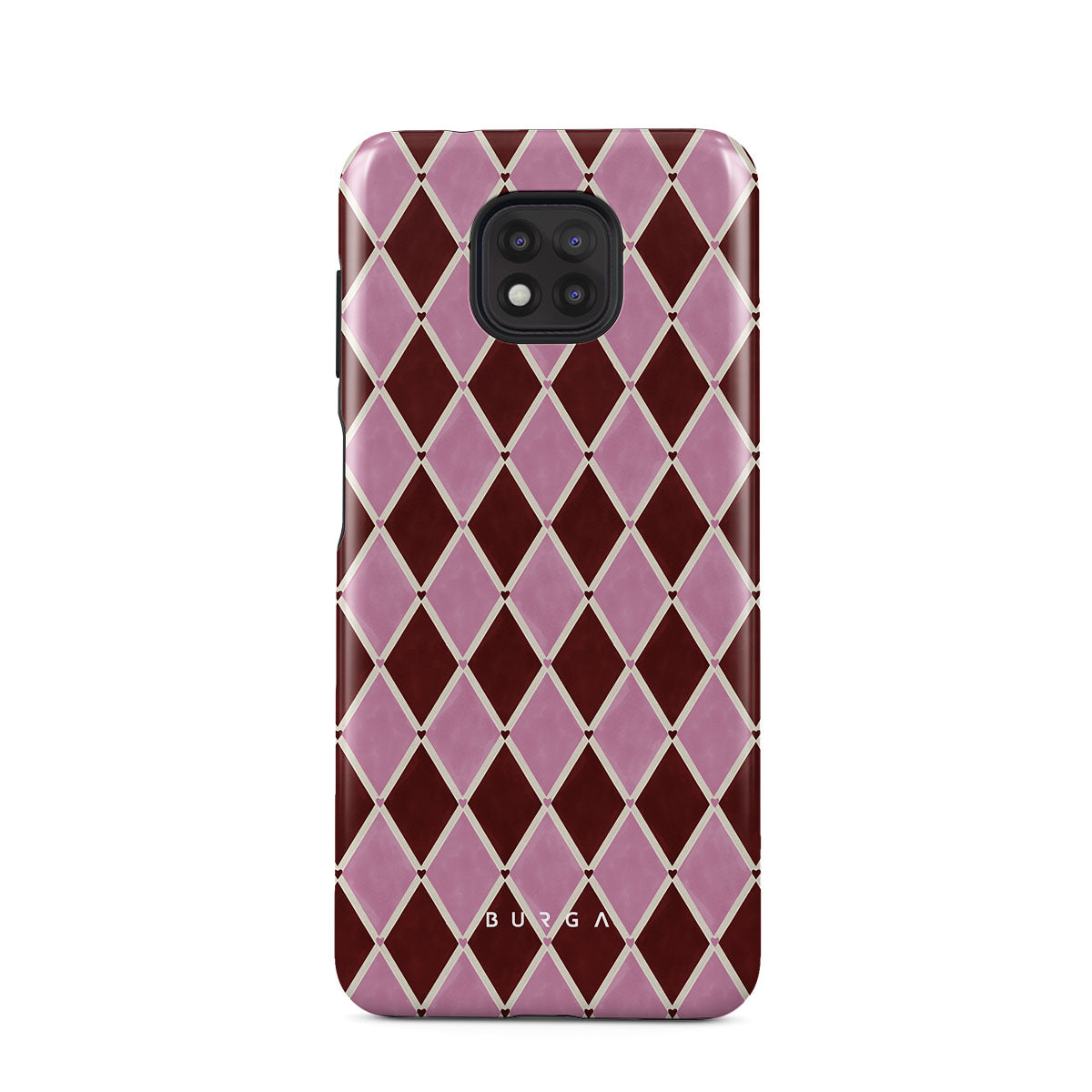 Kenmerken van dit design: harlekijnpatroon, roze ruiten, diep rode achtergrond