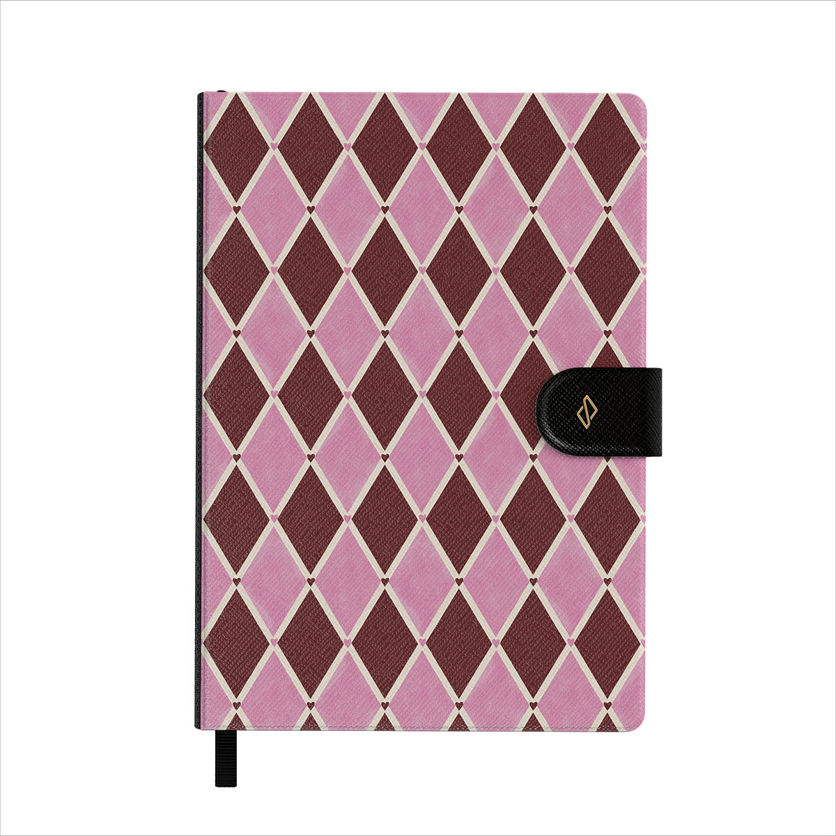 Kenmerken van dit design: harlekijnpatroon, roze ruiten, diep rode achtergrond