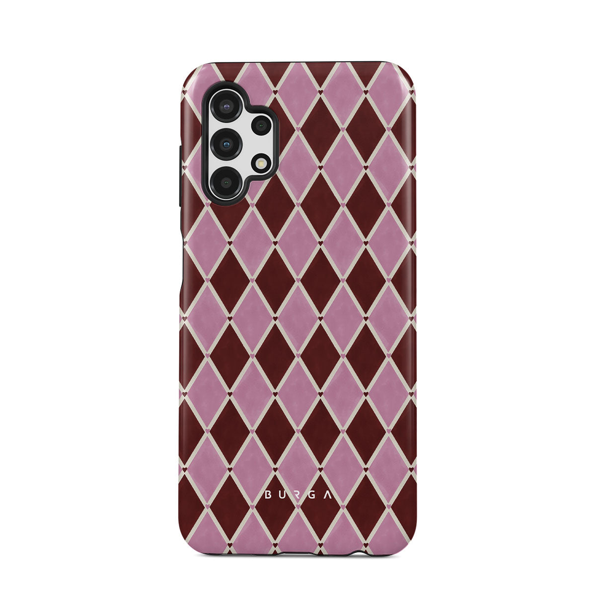 Kenmerken van dit design: harlekijnpatroon, roze ruiten, diep rode achtergrond