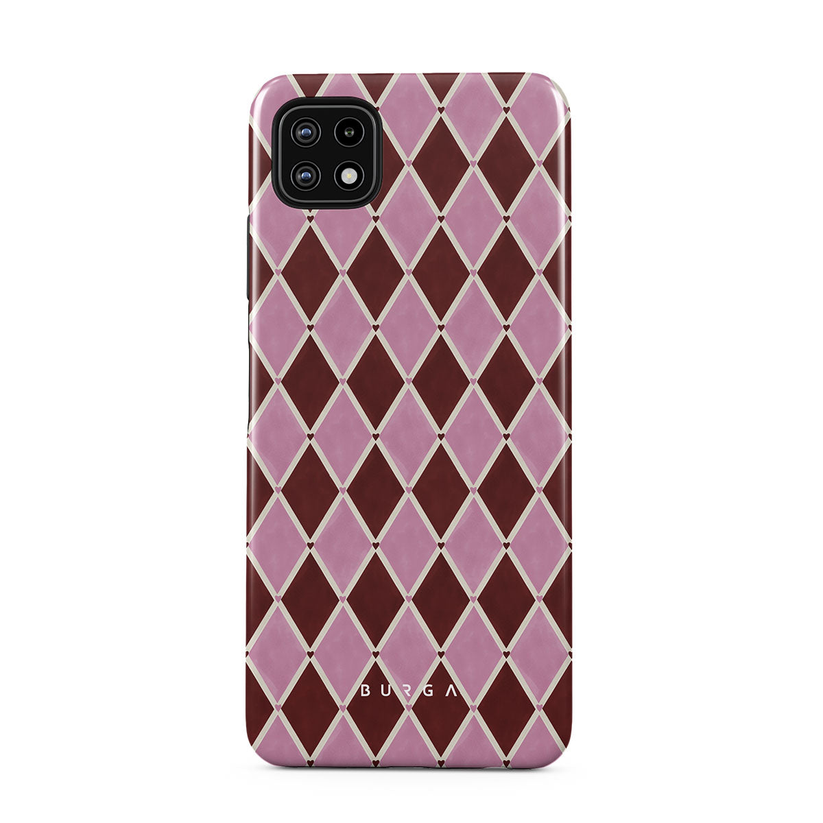 Kenmerken van dit design: harlekijnpatroon, roze ruiten, diep rode achtergrond