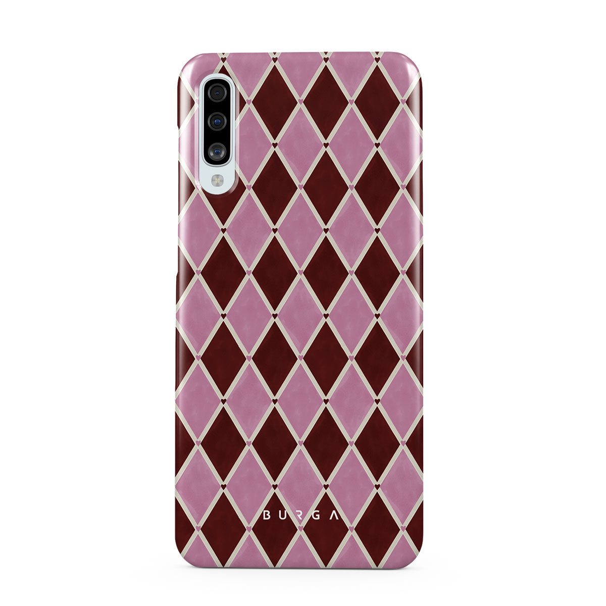 Kenmerken van dit design: harlekijnpatroon, roze ruiten, diep rode achtergrond
